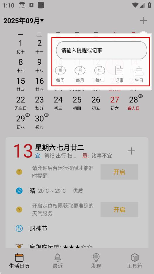 生活日历的提醒系统非常强大,语音添加提醒,仅需对手机说:“明天晚上7 点看电影”,即可自动识别日期建一条提醒;重复提醒、提前提醒随心设。