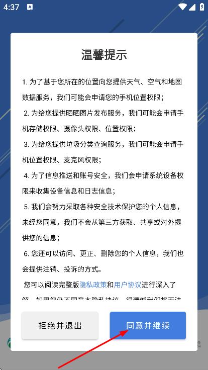 1、在温馨提示弹窗中,点击同意并继续,进入软件。
