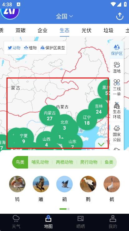 4、在生态相关页面,可查看全国生态相关分布等信息。