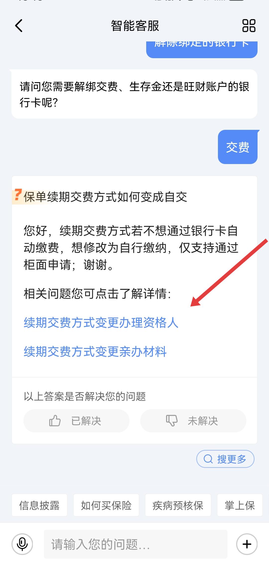 3、若选择交费类银行卡,需要按客服指引确认保单续期交费方式变更如改为自交需柜面申请。