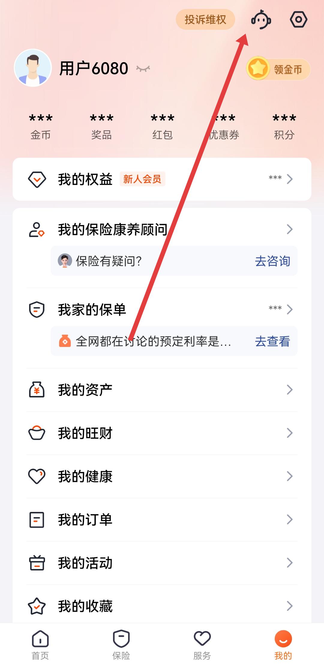 1、打开平安金管家APP,进入底部导航栏我的页面,点击右上角耳机形状的智能客服图标,进入客服对话界面。