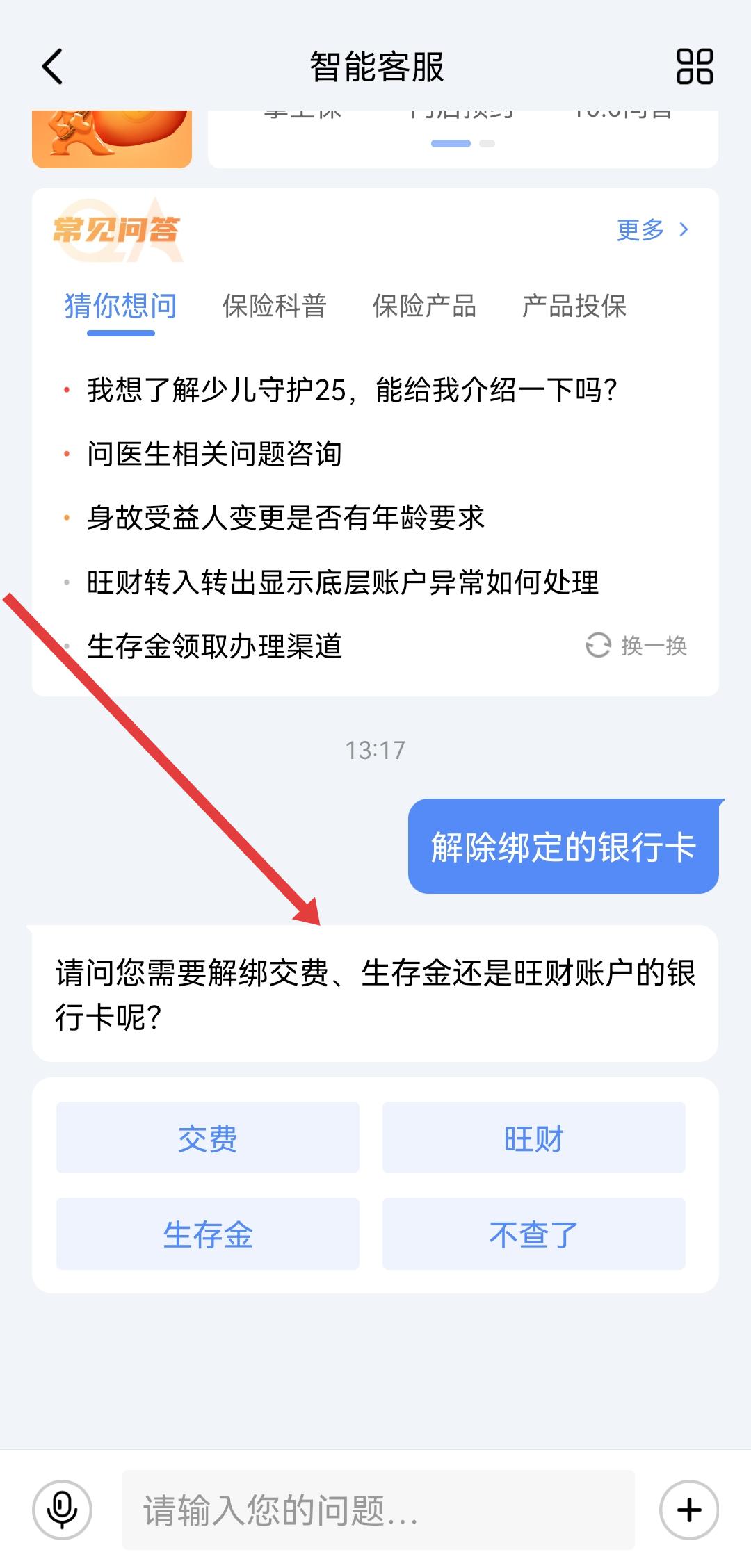 2、在智能客服输入框中发送解除绑定的银行卡,根据客服回复选择需解绑的银行卡类型交费/生存金/旺财账户。