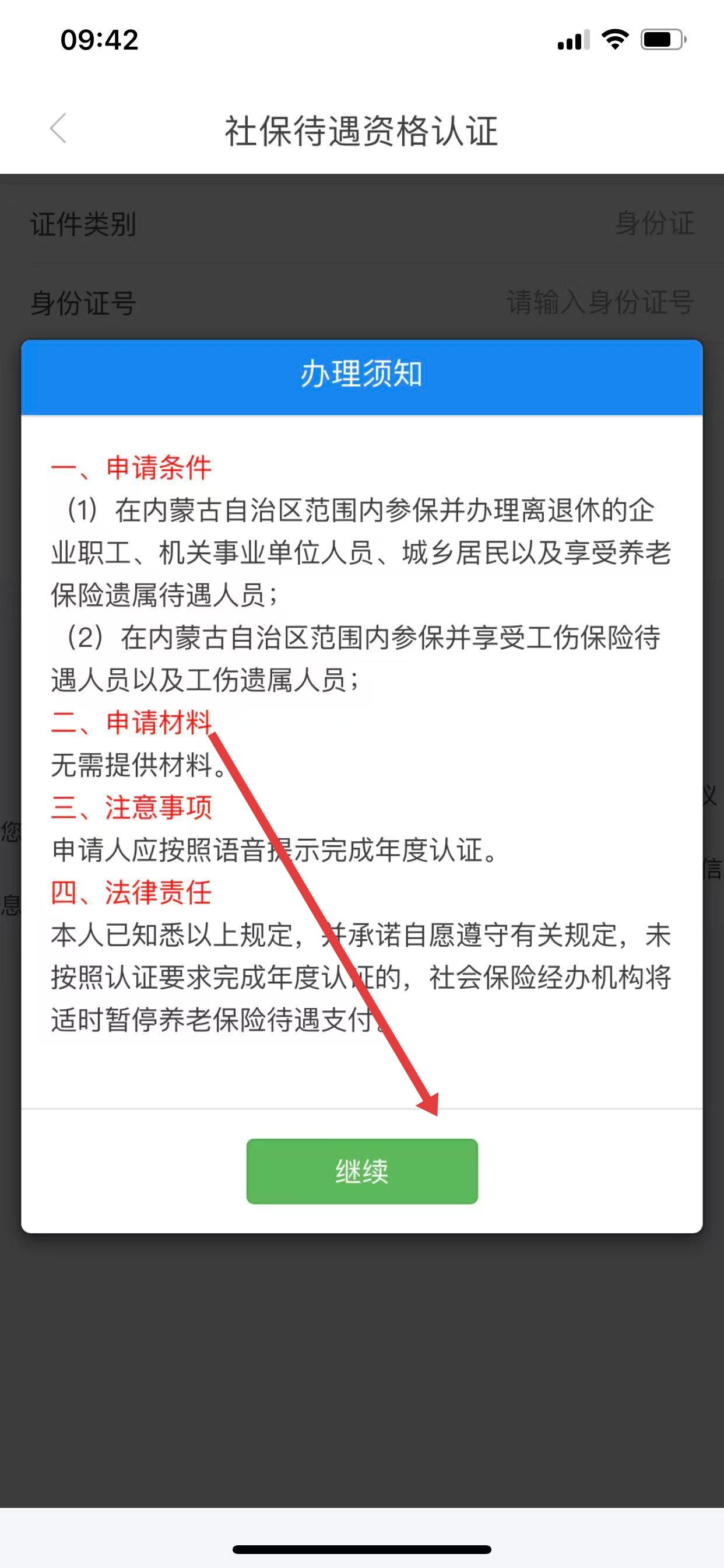 2、在弹出的办理须知窗口,仔细阅读内容后,点击继续按钮。