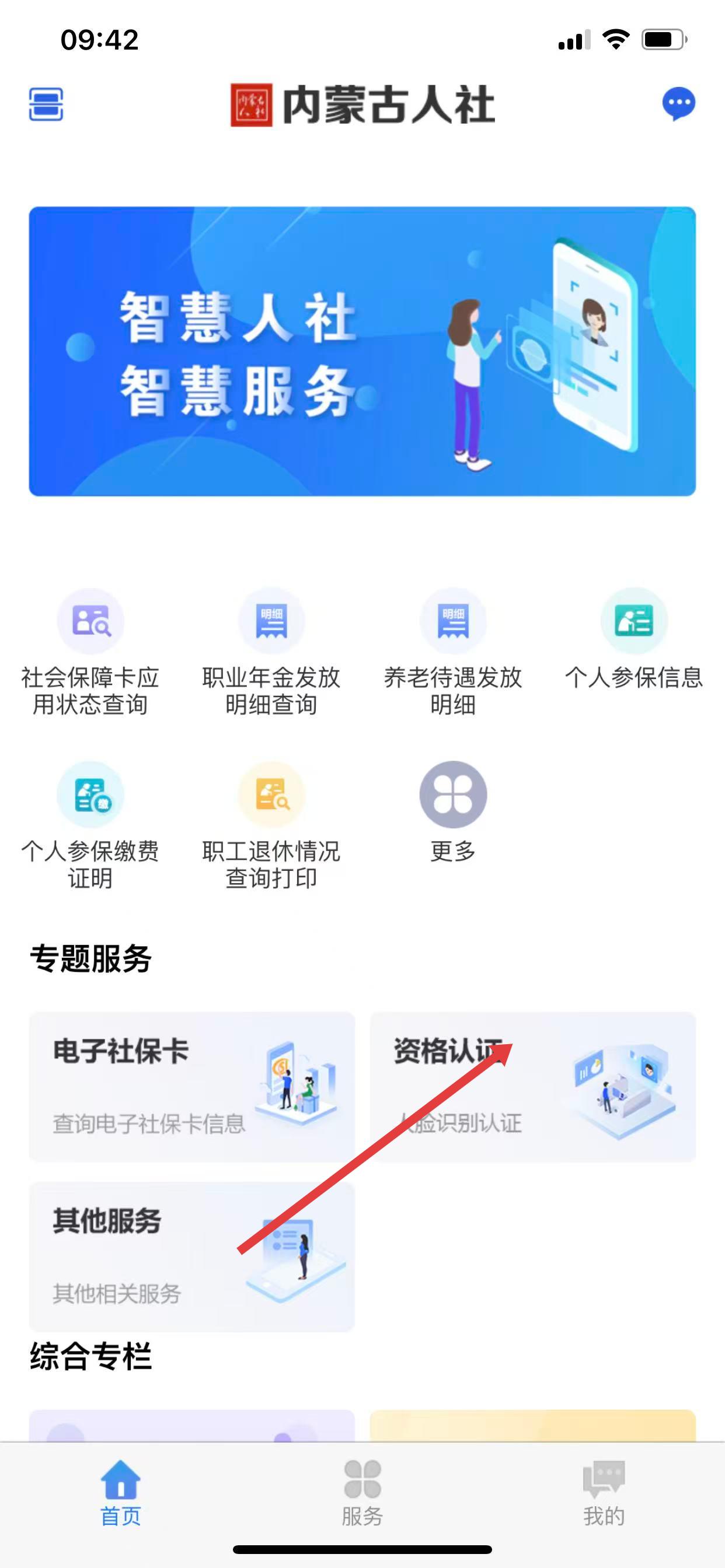 1、打开内蒙古人社app,点击专题服务中的资格认证选项。