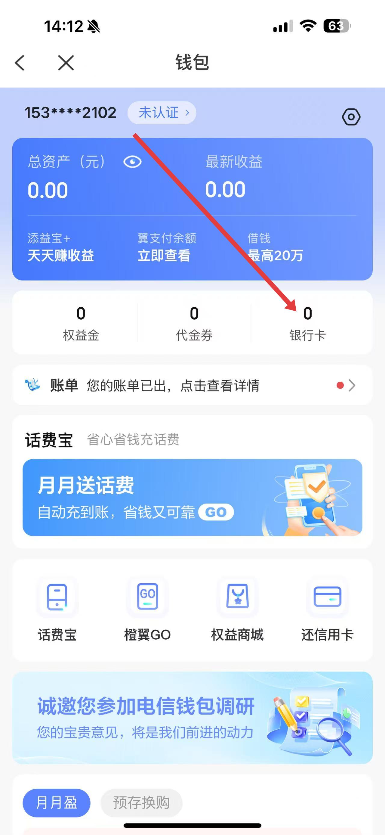 3、在钱包页面中,点击银行卡选项 ,按照页面提示进行身份认证等操作后,即可绑定银行卡。