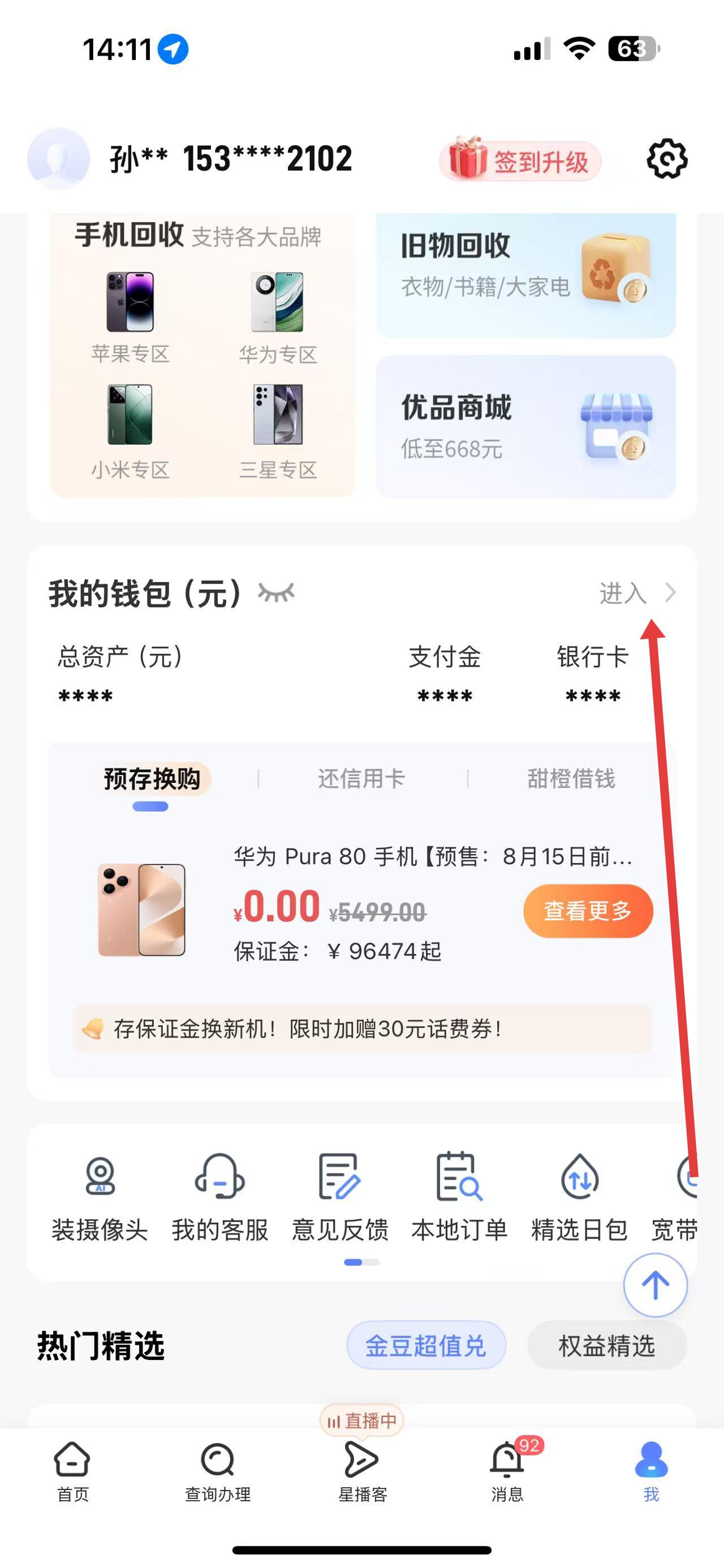 2、在个人中心界面,找到我的钱包板块,点击进入,进入钱包页面。