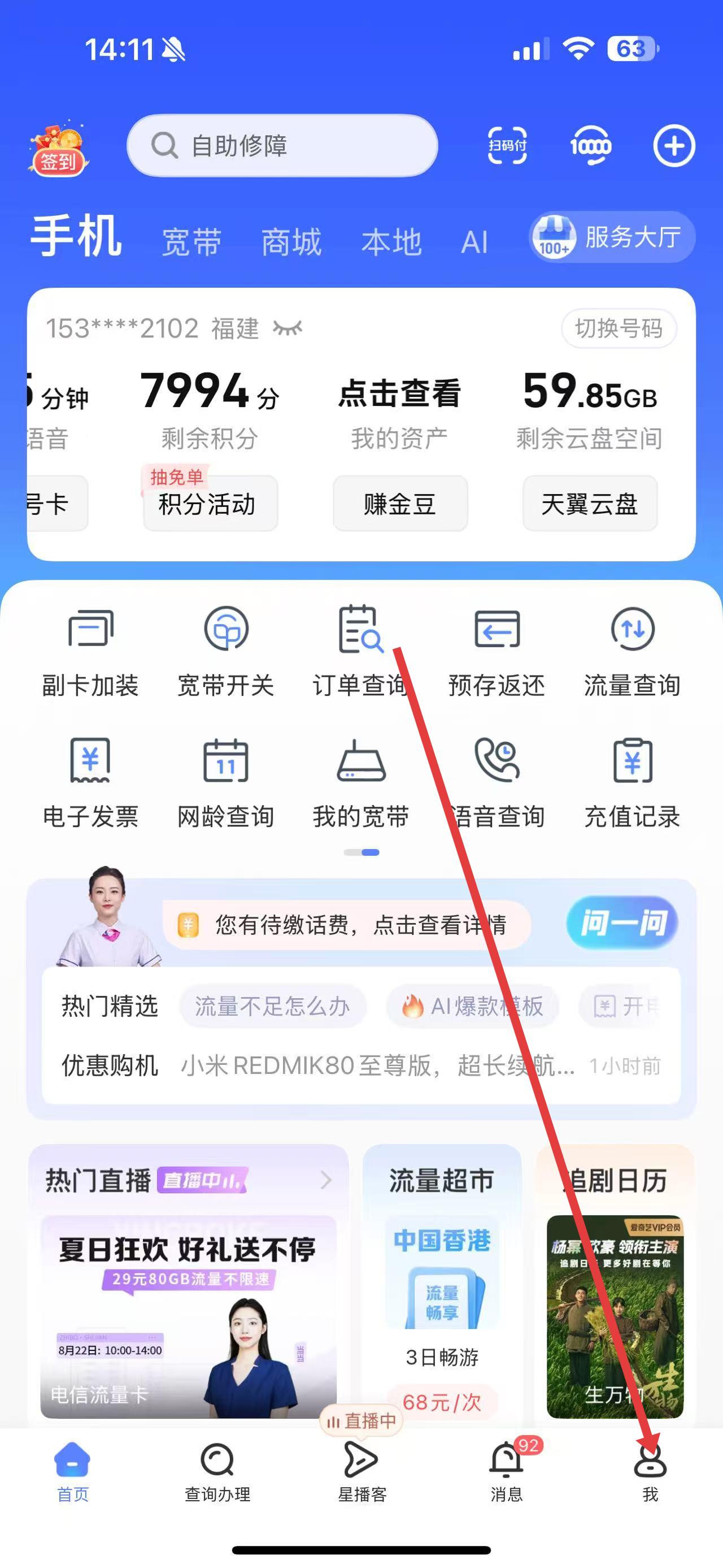 1、打开中国电信APP,点击底部导航栏中的我,进入个人中心界面。