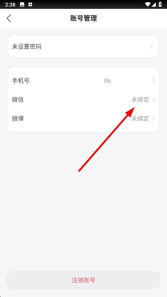 4、在账号管理页面中,找到微信选项,点击其右侧的未绑定,按照后续提示完成微信号的绑定操作。