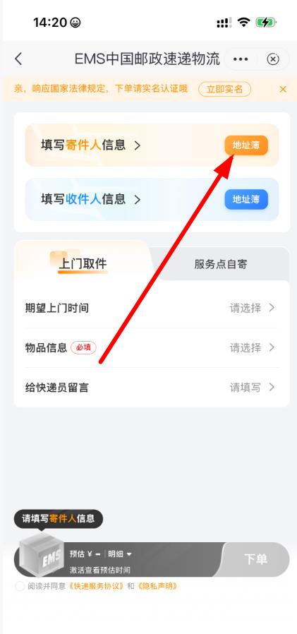 2、在寄件页面,点击填写寄件人信息旁的地址簿,若地址簿无信息,点击下方新建地址填写寄件人地址等信息。