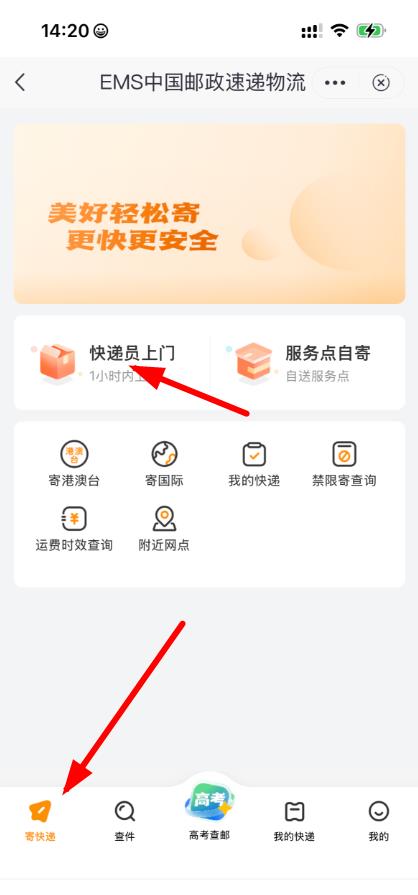 1、打开邮政储蓄相关app并进入EMS中国邮政速递物流界面,点击底部寄快递按钮,再选择快递员上门服务。