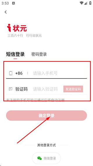 3、在短信登录页面输入手机号和验证码,点击确定登录,完成登录操作。