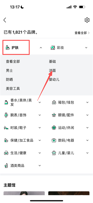 2、在商品分类页面,选择护肤分类下的洁面选项,进入洁面商品列表页面。
