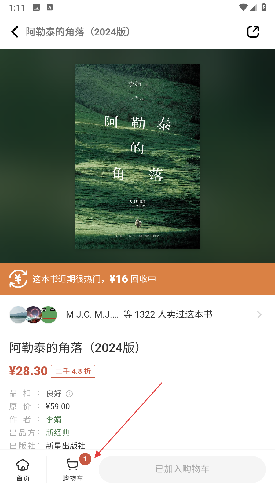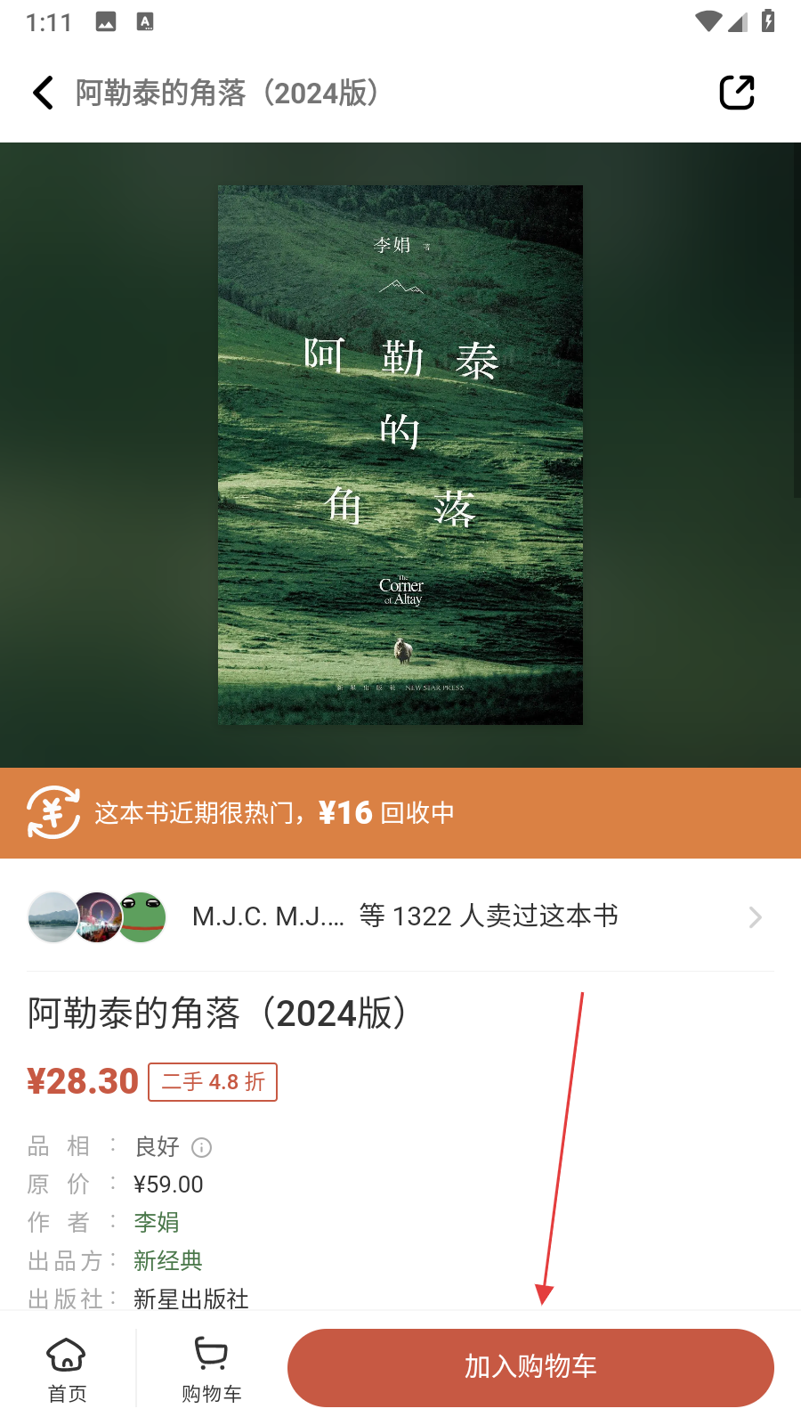 2、在商品详情页,查看价格、品相等信息,确认要购买后,点击加入购物车。