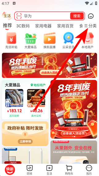 1、在焕新生活页面,点击右上角功能切换栏,进入分类页面。