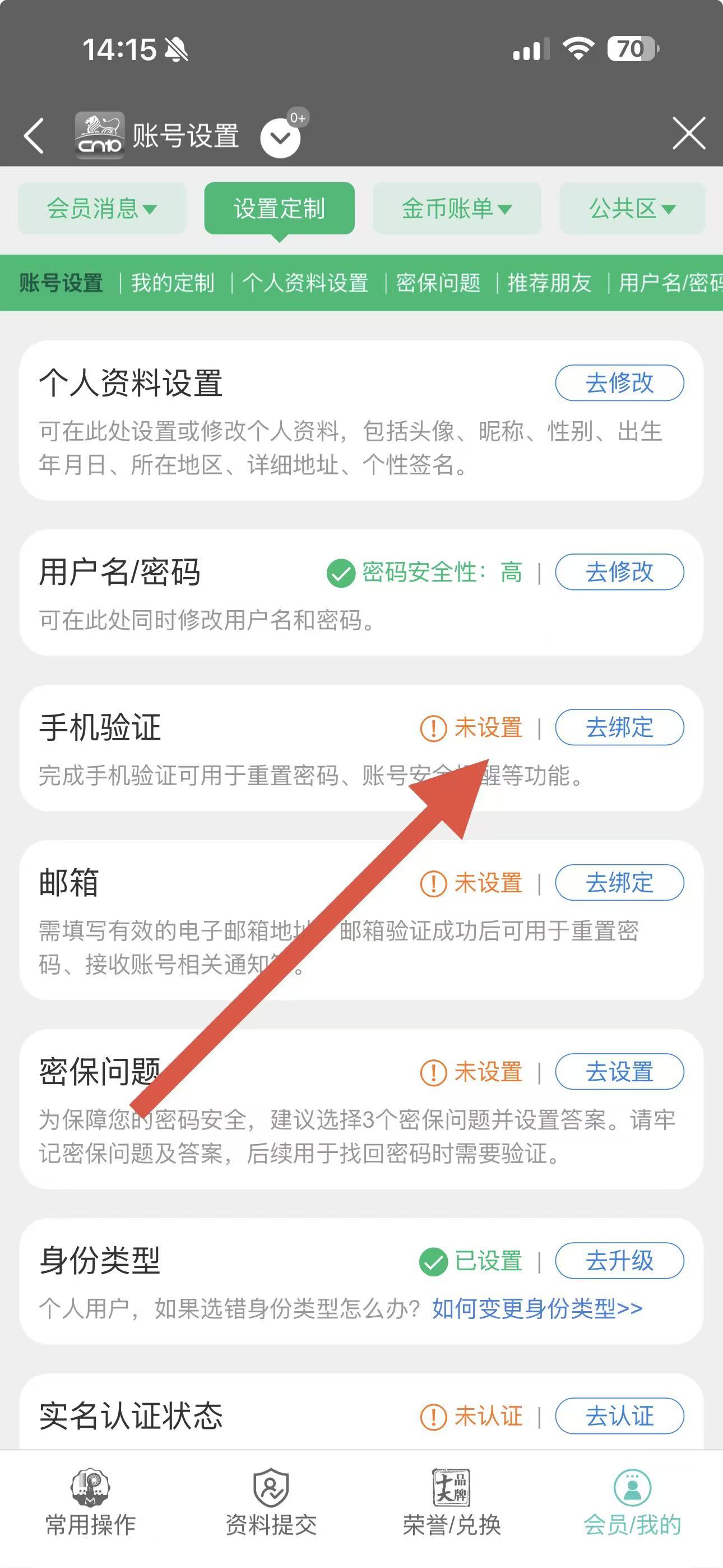 3、在账号设置界面里,找到手机验证栏,点击右侧的去绑定。