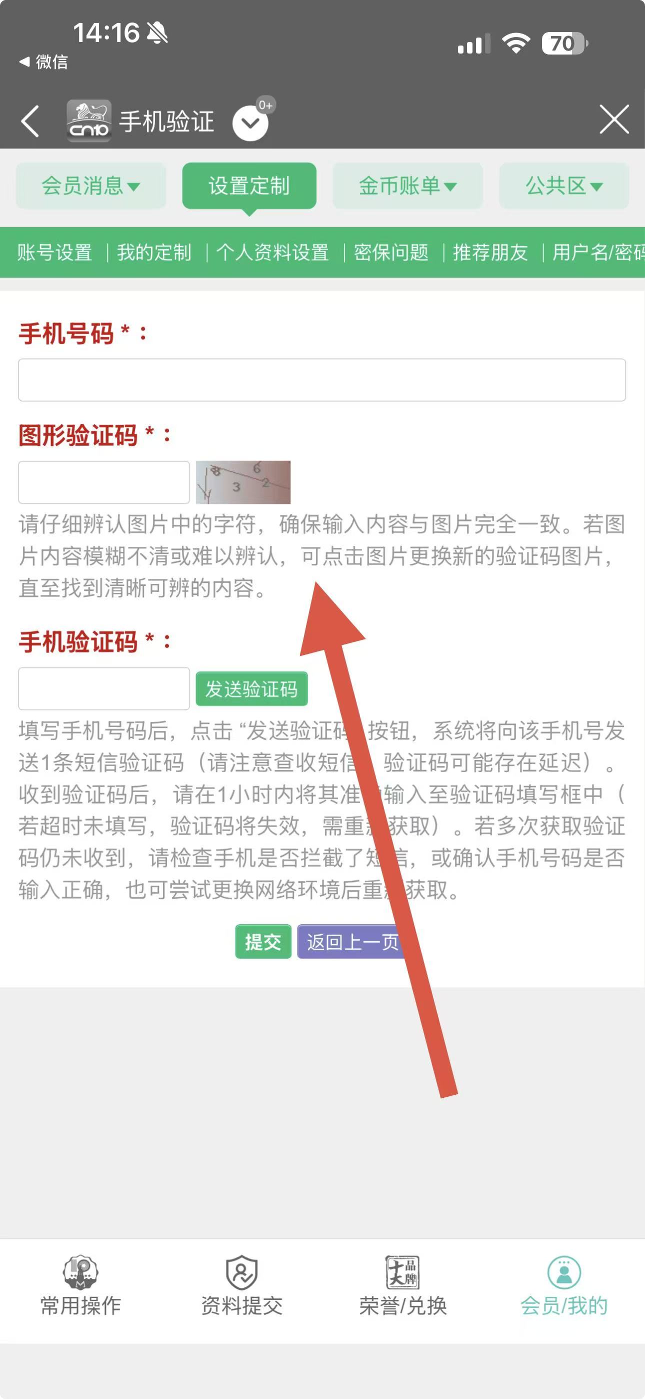 4、在手机验证页面,依次填写信息,点击发送验证码获取手机验证码并填入,最后点击提交,即可完成手机号码的绑定。