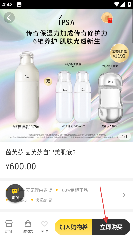 4、在商品详情页,点击立即购买按钮,即可购买该商品。