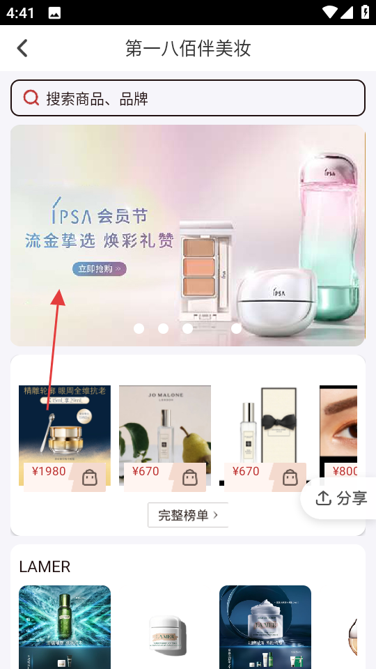 2、在美妆页面,点击IPSA会员节相关区域,进入IPSA商品页面。