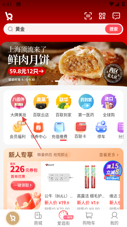 1、进入软件首页,点击大牌美妆选项,进入美妆页面。