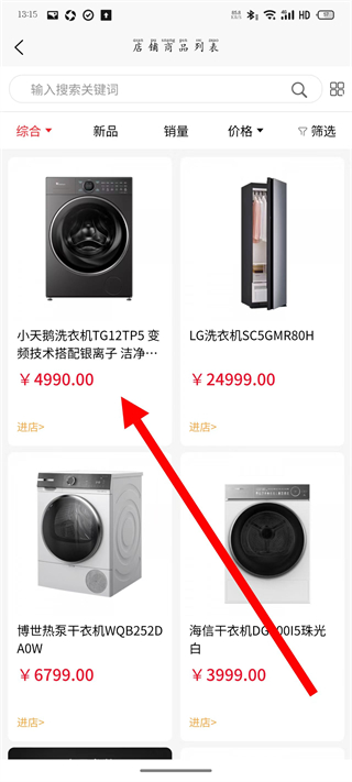 4、在商品列表中,选择想要的洗衣机商品,进入详情页面。