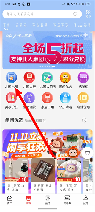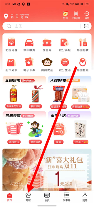 1、打开掌尚北国,首页点击底部商城,进入页面。
