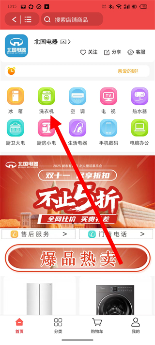 3、在北国电器页面,点击洗衣机分类,进入商品列表。