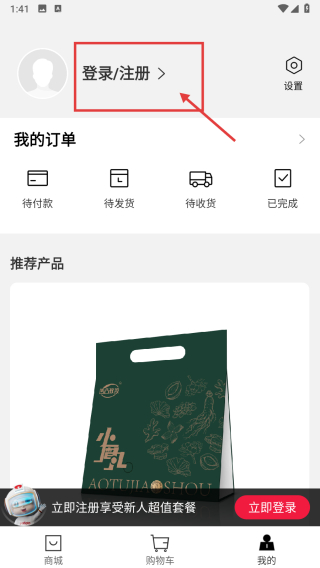 2、在个人中心,点击登录/注册区域,进入登录注册界面。