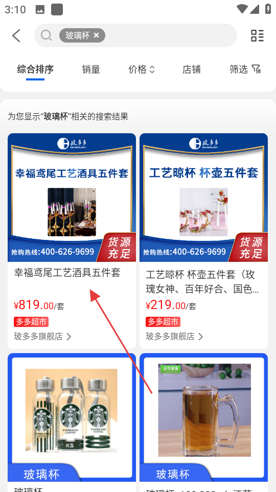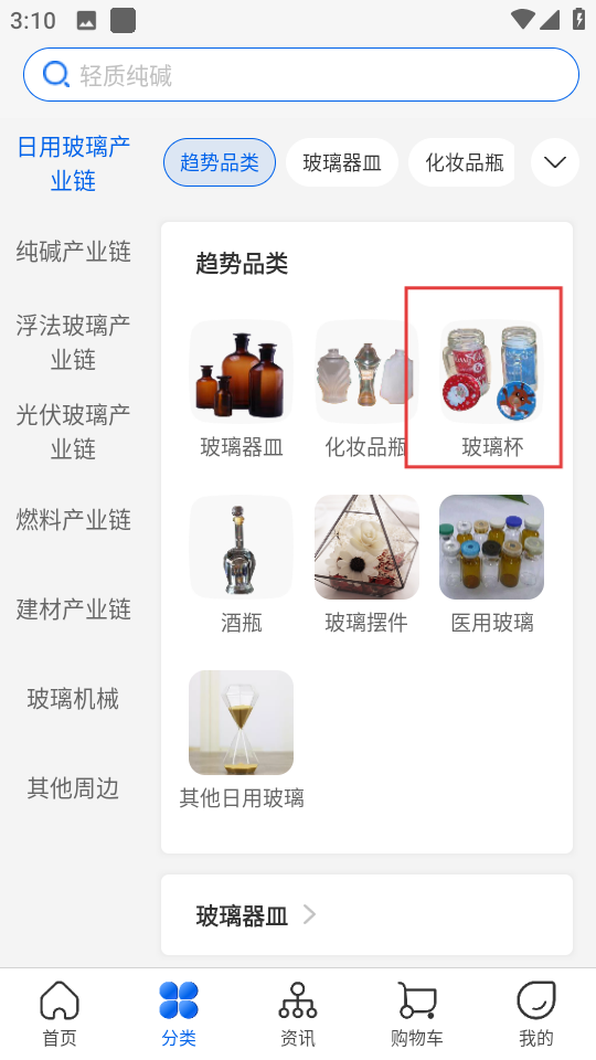2、在分类页面,选择玻璃杯,进入玻璃杯相关商品页面。
