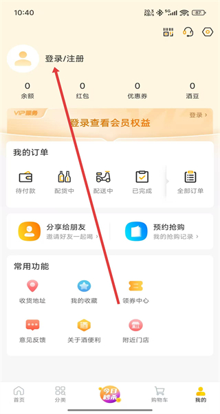 2、个人中心页面点击“登录/注册”,进入登录界面。