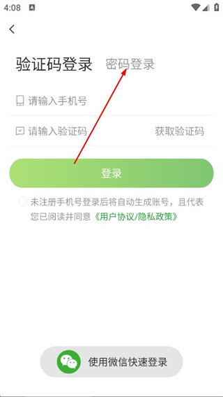 3、在登录界面,点击密码登录,切换至密码登录页面。