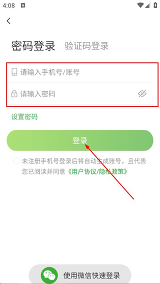 4、在密码登录页面,输入手机号和密码,点击登录完成账号登录。