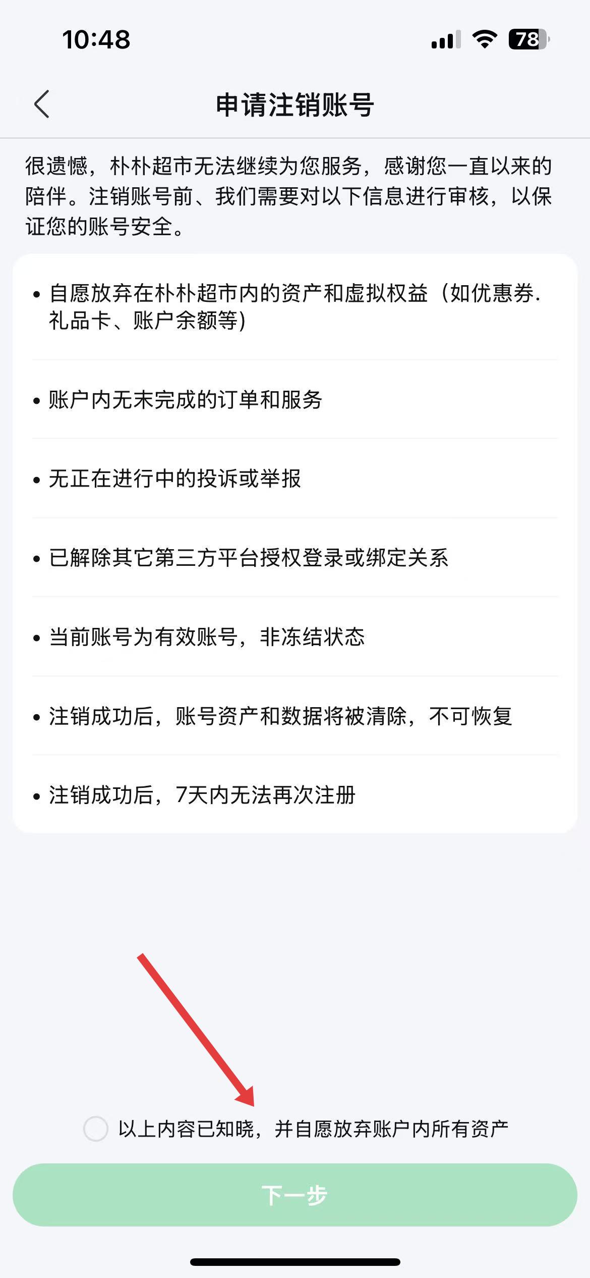 3、进入申请注销账号页面后,了解注销后放弃的权益以及账号数据处理等情况,按后续提示点击下一步完成账号注销操作。