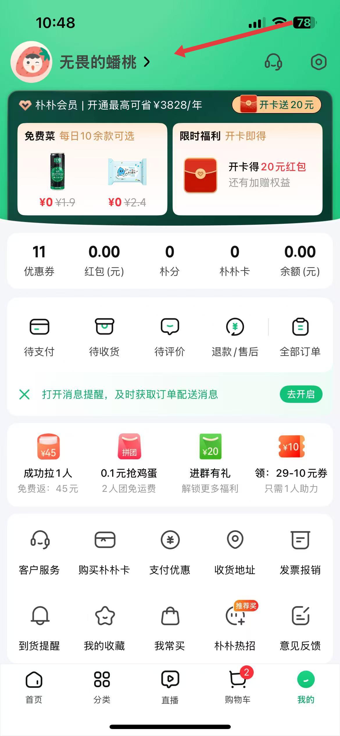 1、打开朴朴超市app点击底部导航栏的我的选项,进入个人中心界面,找到并点击头像右侧箭头,进入账号管理页面。