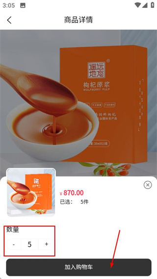 4、在数量选择页面调整商品数量后,点击加入购物车完成操作。