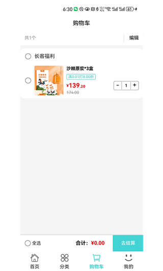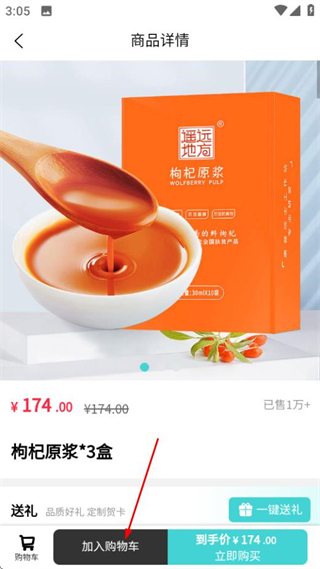 3、在商品详情页面点击加入购物车按钮,进入数量选择页面。