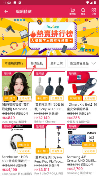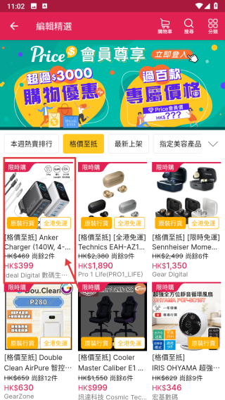 2、在编辑精选页面,点击价格至抵分类,浏览价格优惠商品列表。