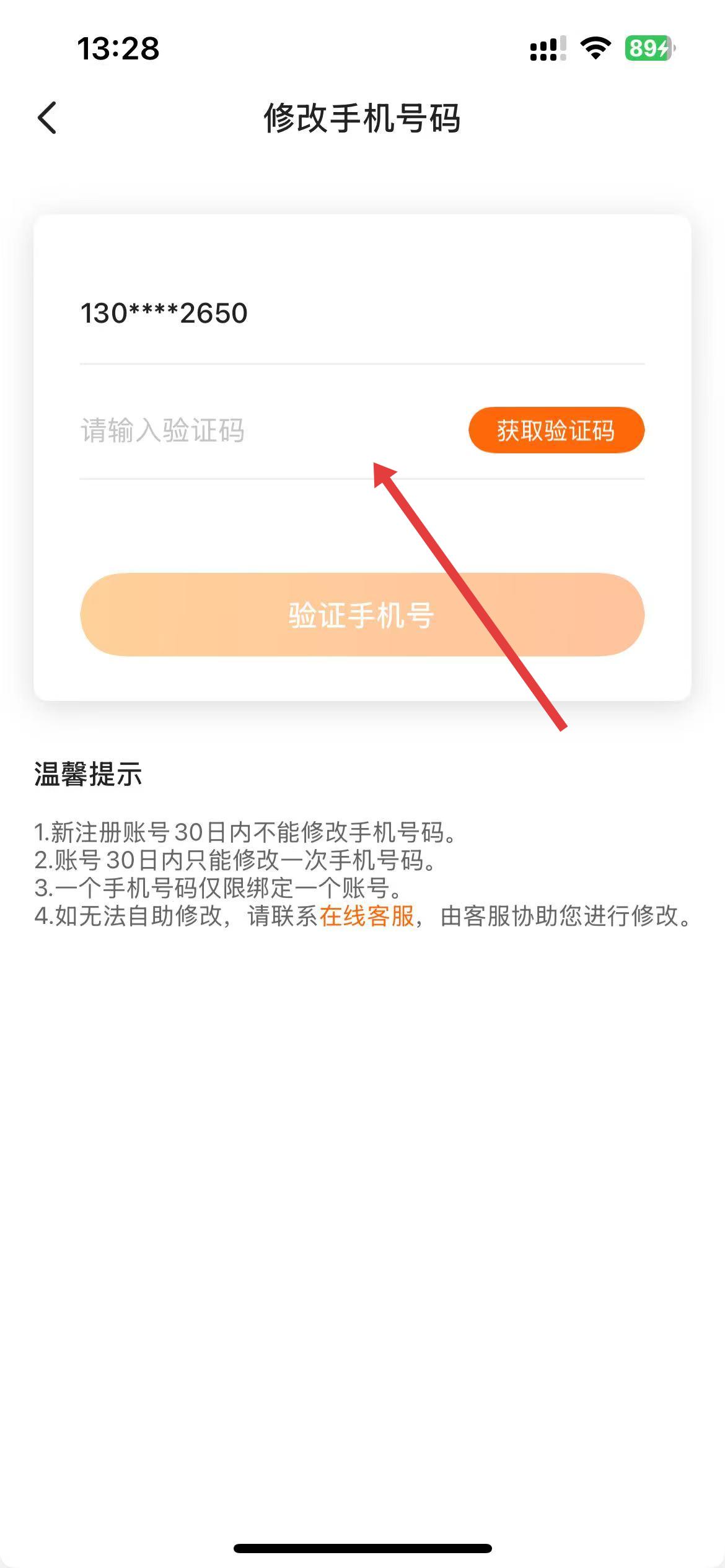 3、在修改手机号码界面,先点击获取验证码按钮,收到验证码后填入对应输入框,再按页面提示操作完成手机号验证,即可修改绑定的手机号。
