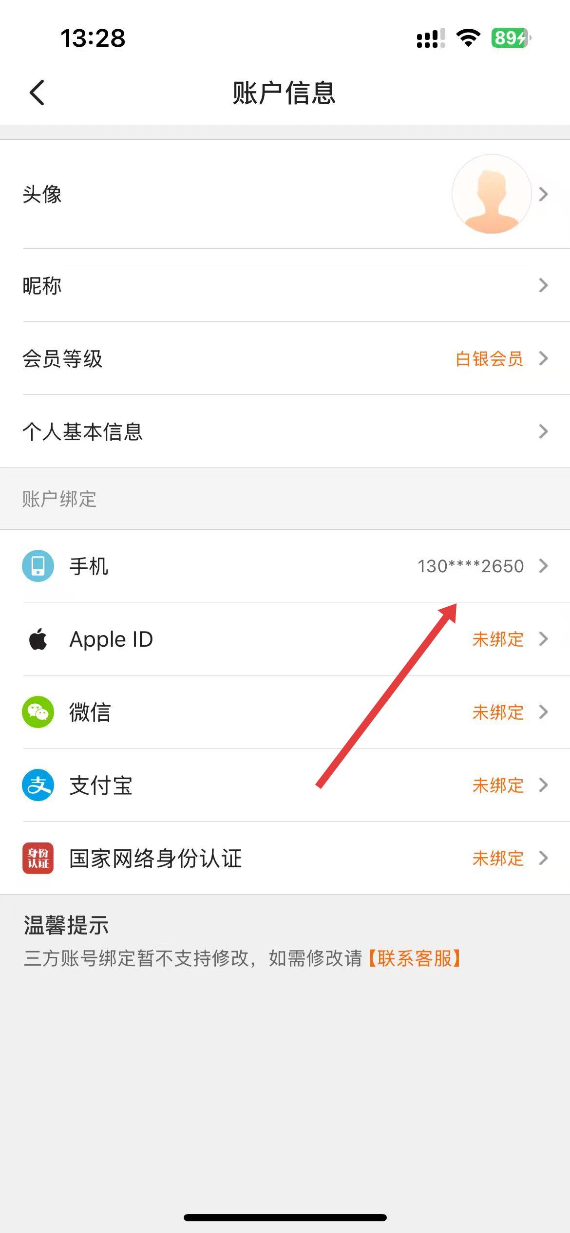 2、进入账户信息页面后,找到手机选项,点击进入修改手机号码界面。