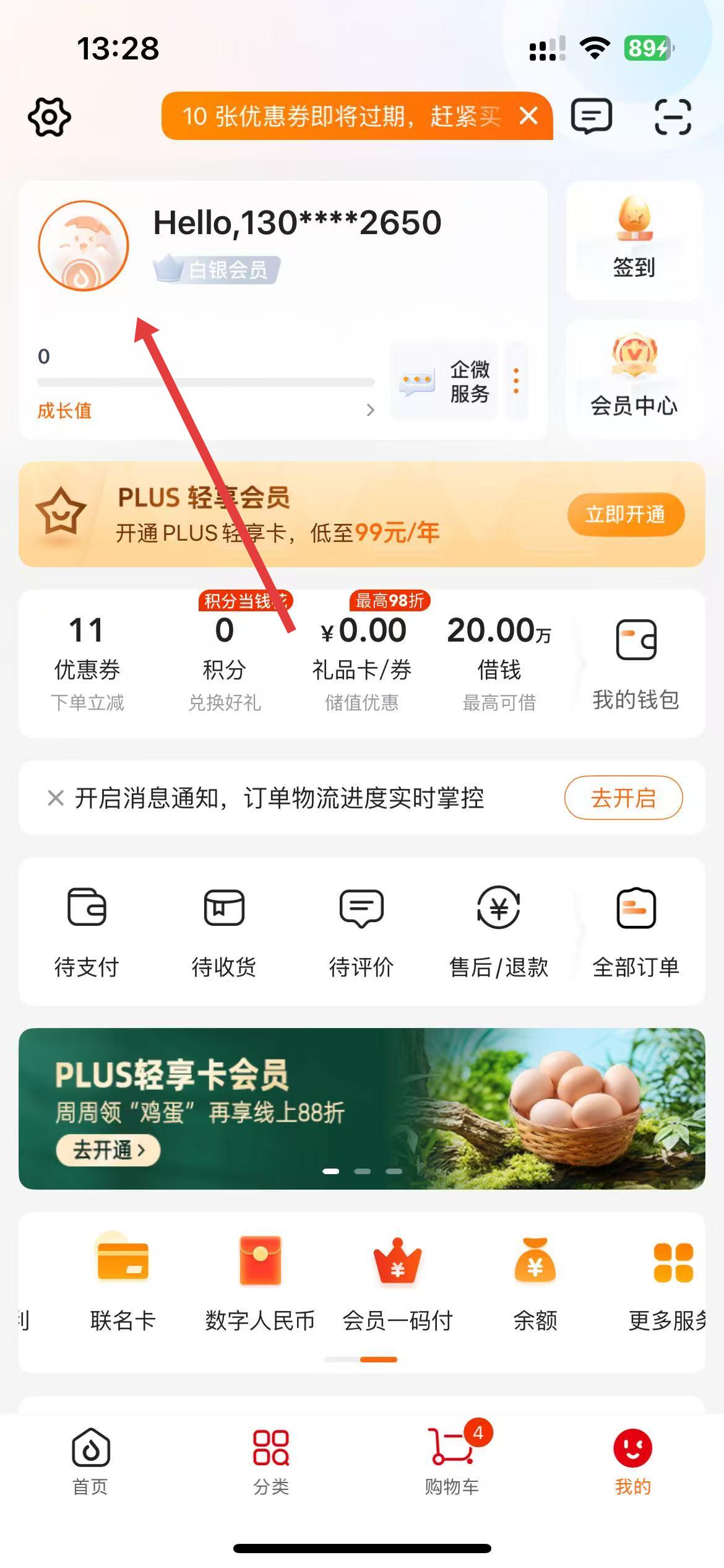1、打开多点购物app,点击底部导航栏我的选项,在个人页面中,点击头像区域,进入账户信息页面。