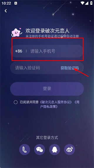 3、在登录页面填写验证码,勾选协议后,点击登录完成账号登录操作。