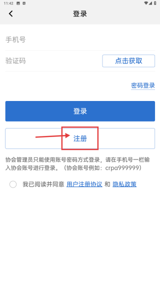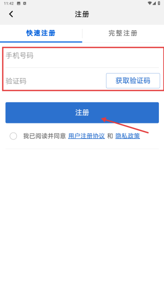 4、输入手机号码和验证码,点击注册按钮,完成账号注册操作。