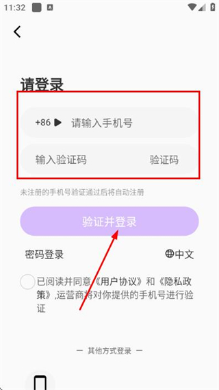 3、在登录页面填写手机号和验证码,勾选协议后,点击验证并登录完成账号登录操作。