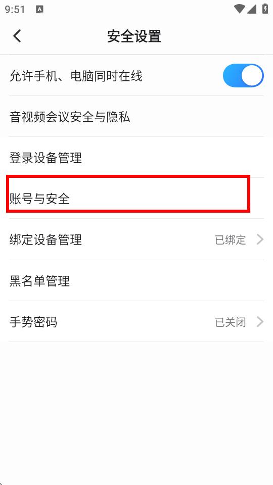 3、进入安全设置页面后,点击账号与安全。