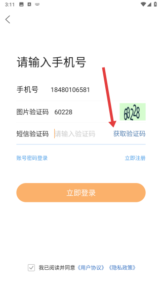 4、在填写好上方信息后,点击获取验证码按钮等待验证码填写,即可完成登录操作。