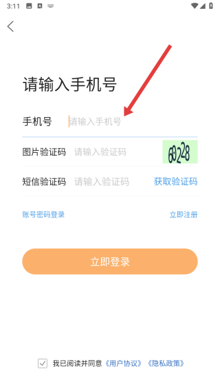 3、在跳转到手机号登录页面后,点击输入框填写手机号和图片验证码,以便获取短信验证码。