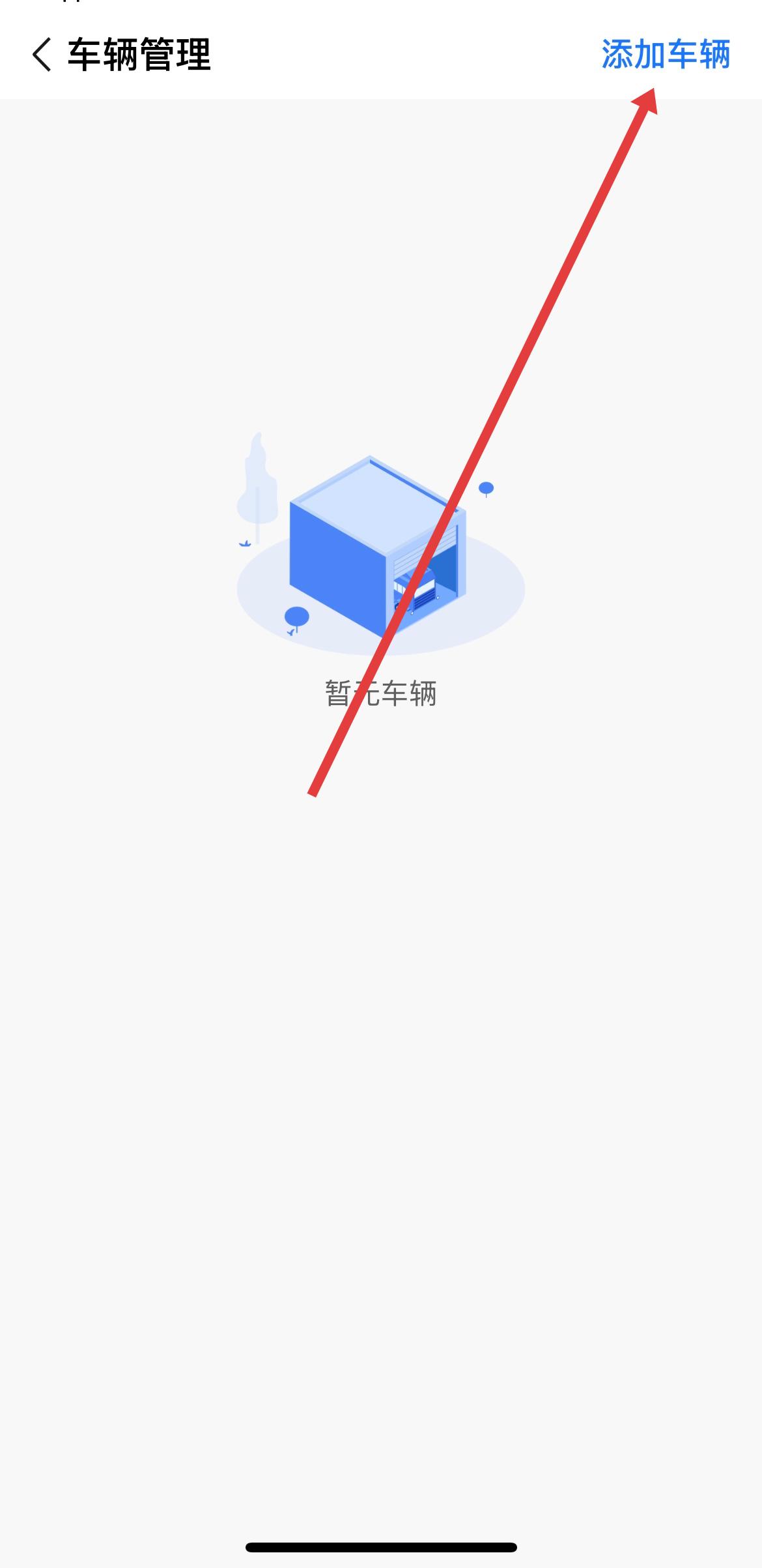 2、进入车辆管理页面后,若没有已添加车辆,找到右上角的添加车辆按钮点击进入,添加你的车辆。