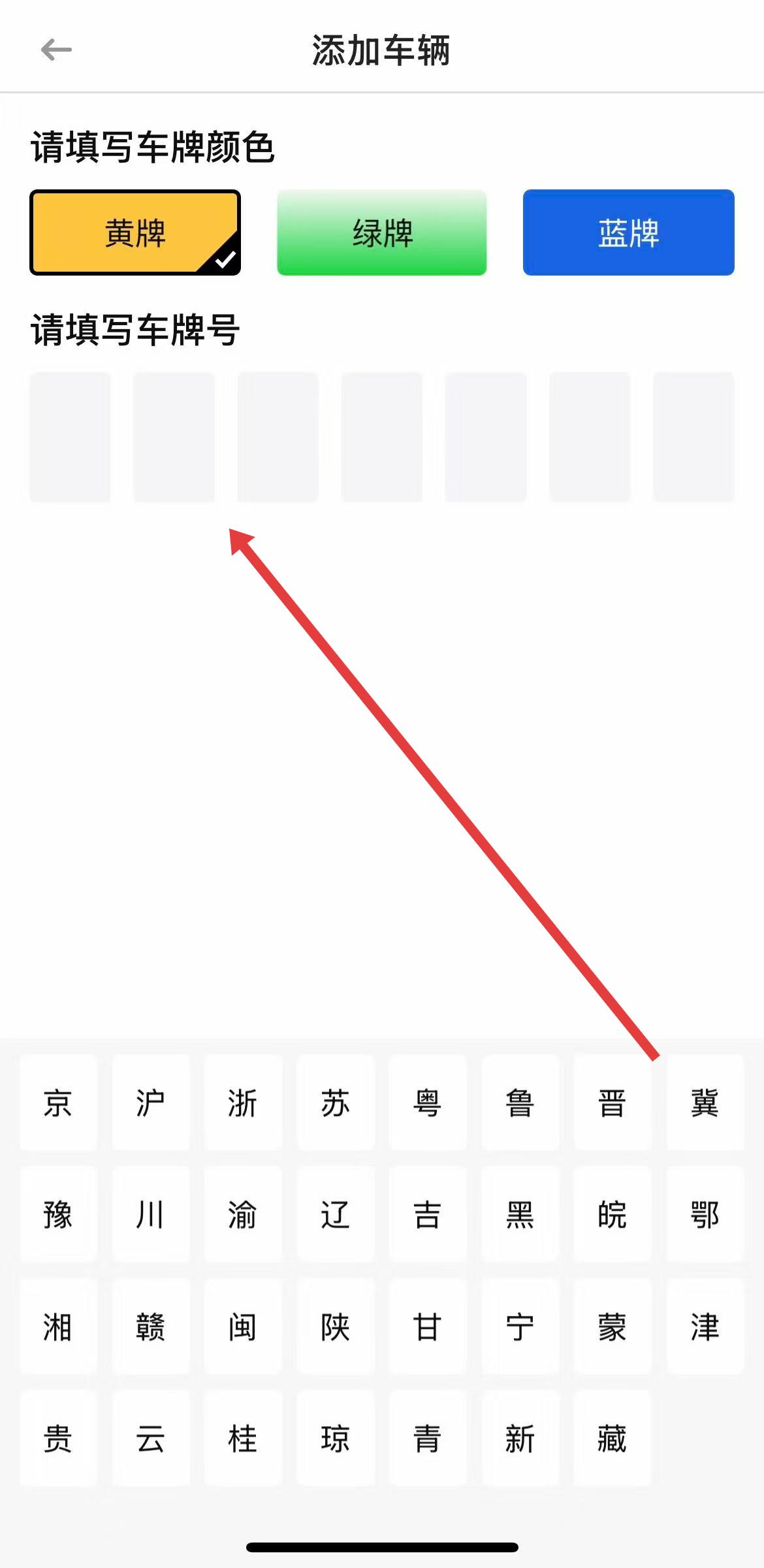3、在添加车辆页面,先选择车牌颜色,然后在下方输入框中准确填写车牌号,完成车辆添加操作。