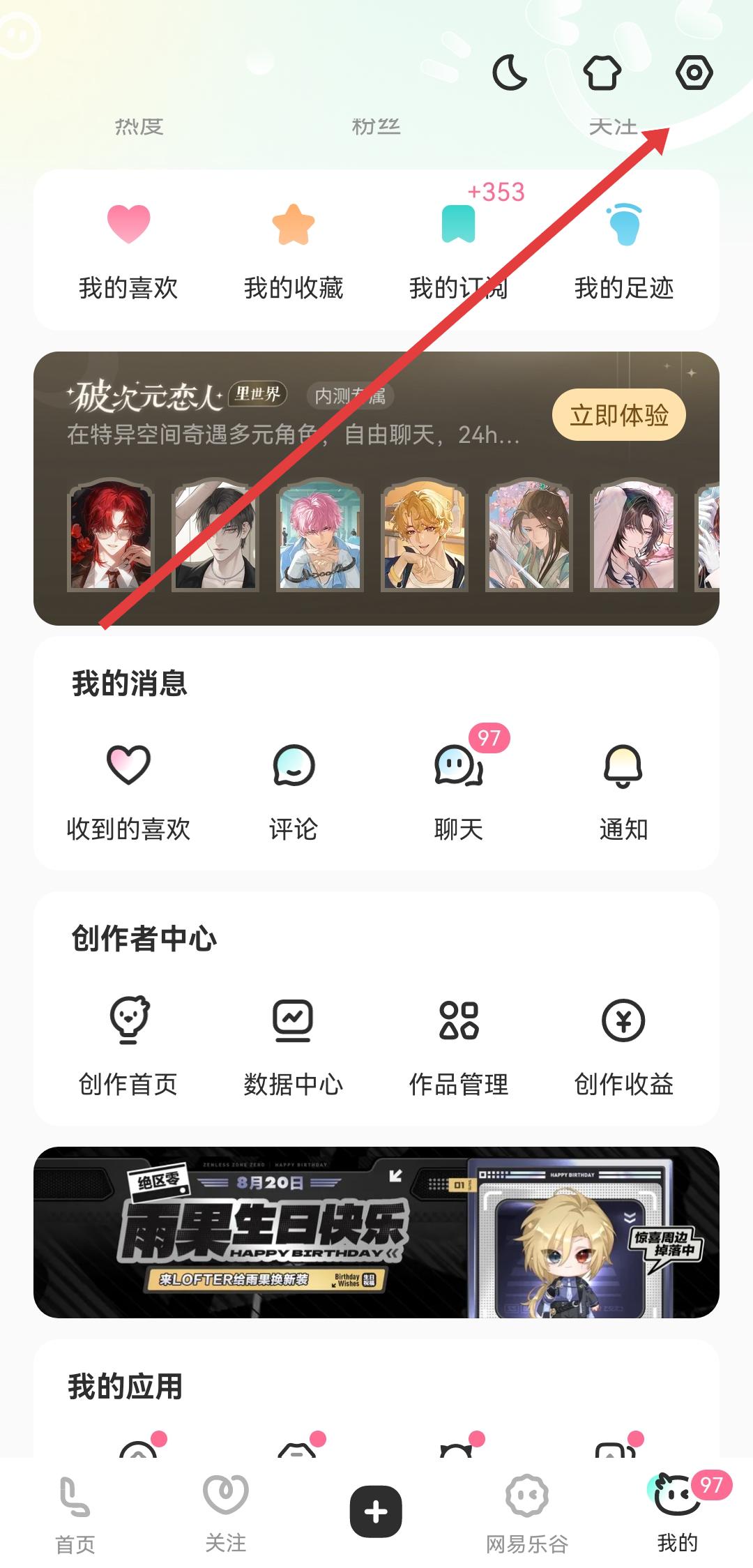 1、打开LOFTERAPP,点击底部导航栏我的进入个人中心,再点击页面右上角齿轮形状的设置图标。