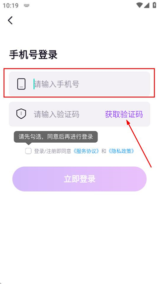 2、在手机号登录页面填写手机号,勾选协议后,点击获取验证码。