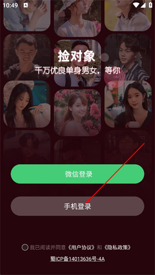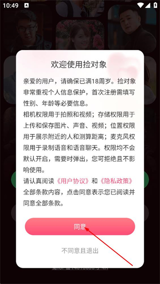 1、在捡对象的欢迎弹窗中,点击同意按钮,进入登录选择页面。